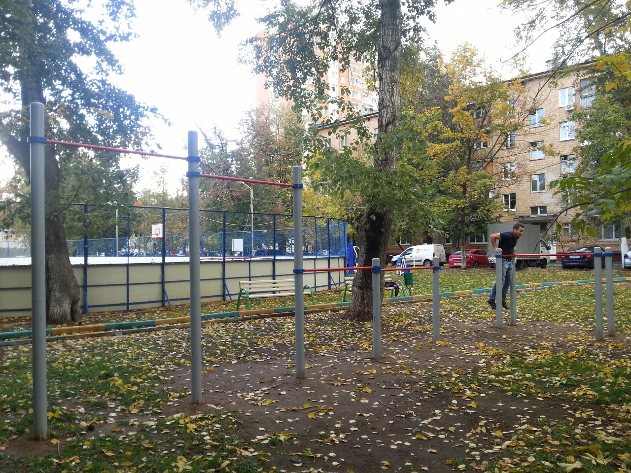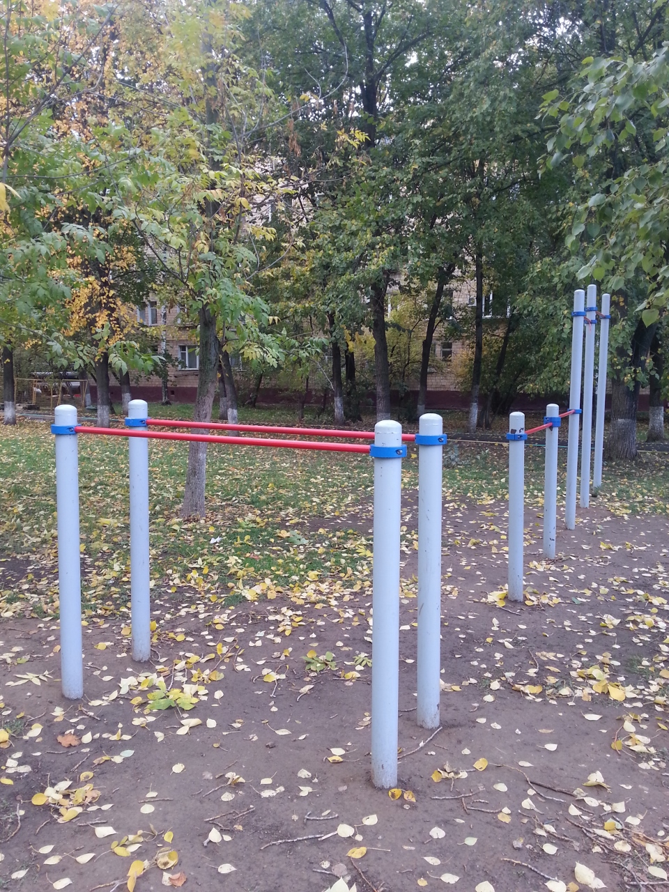 Три разновысоких турника и брусья. Все по минимуму и грязновато осенью. Но треням, конечно, это не помеха.