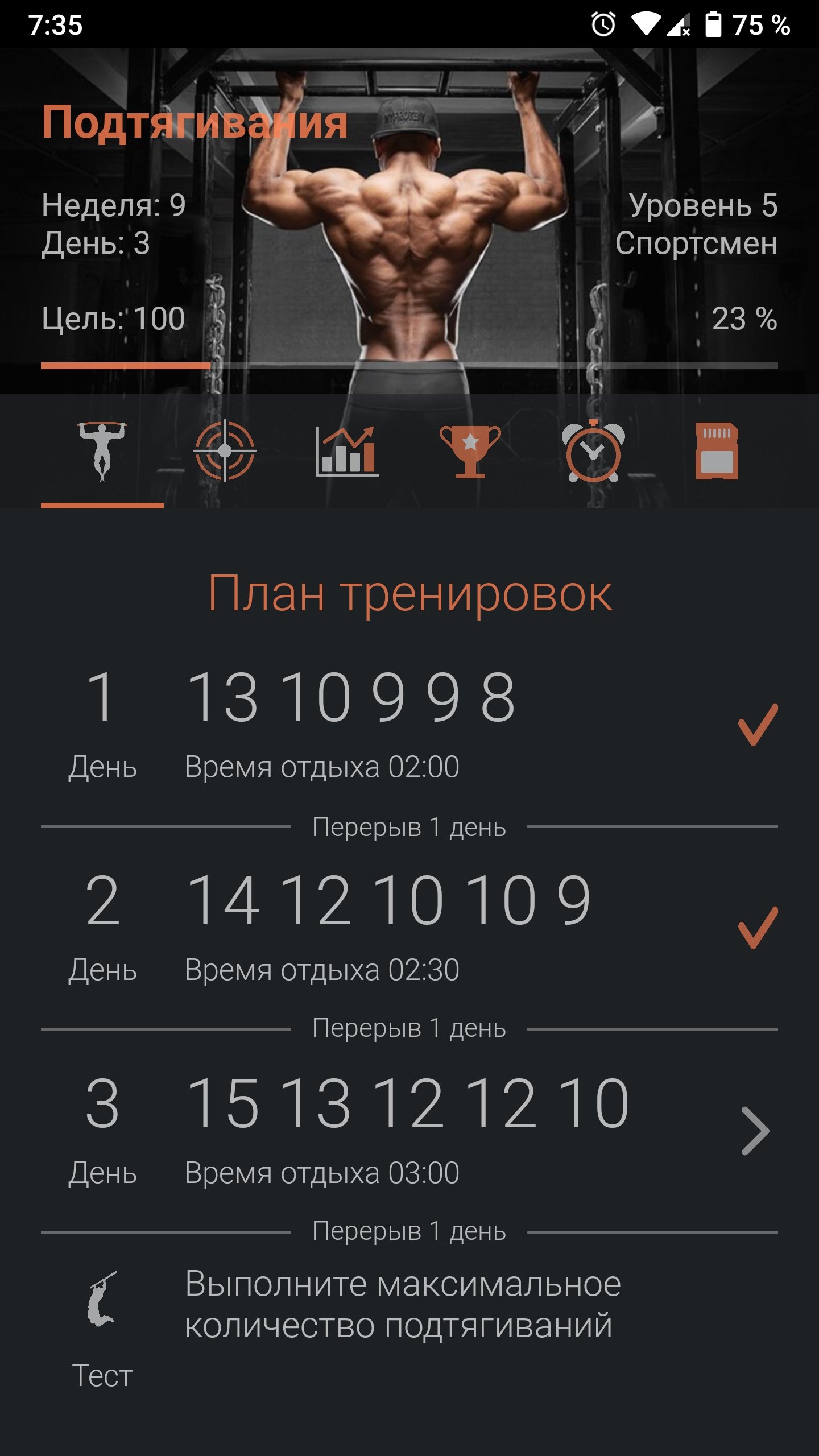 Ну и подтягивания по приложению третий день недели: