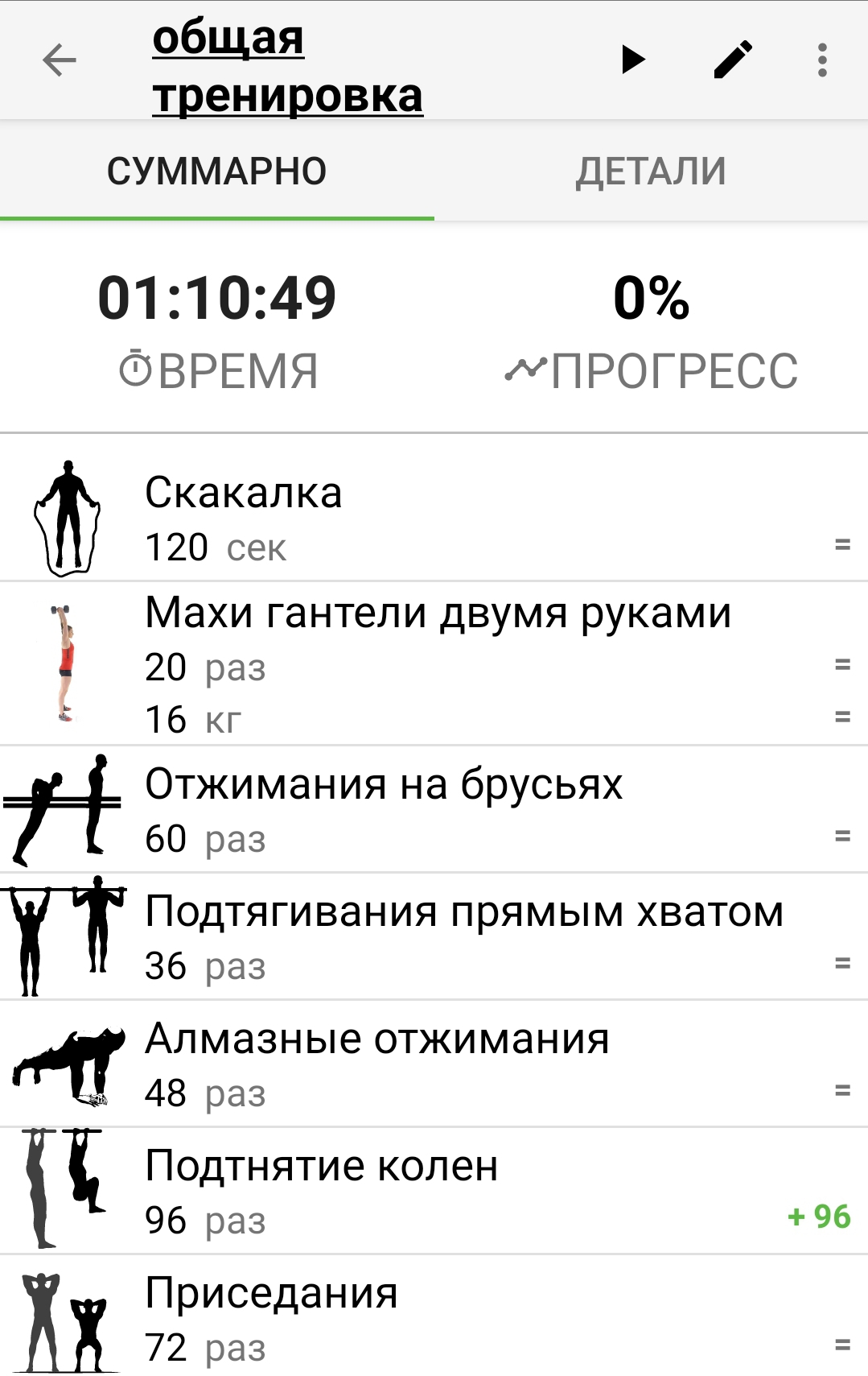 Приседания изначально планировал 10, но при начале тренировки изменил на 12</quote>